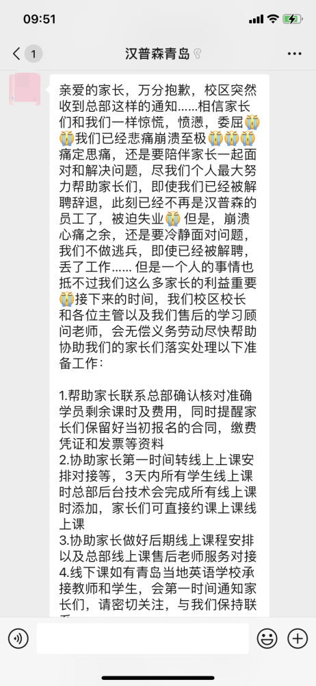 學(xué)校陷入了完全沒有收入的境地,新學(xué)員不敢報名,老的學(xué)員要么大批量要求退費(fèi),要么不再續(xù)費(fèi)和轉(zhuǎn)介紹。作為曾經(jīng)青島市大眾點(diǎn)評外語培訓(xùn)機(jī)構(gòu)第一名的青島漢普森學(xué)校難以為繼。