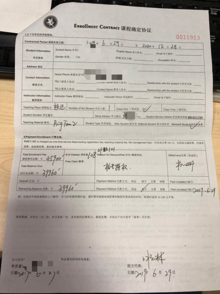 另一位家長于女士說,她也是給孩子報了課,總共交了4萬多元,9月22日才通知開課。9月23日就關(guān)門了,孩子一節(jié)課也沒上過。他們現(xiàn)在找學(xué)校退費(fèi),校長的電話一直打不進(jìn)去,許多老師也已經(jīng)辭職,不再負(fù)責(zé)。漢普森英語收費(fèi)較高,有些家長的學(xué)費(fèi)甚至10萬多。如今他們都網(wǎng)課登不上,線下退費(fèi)找不到人的難題。