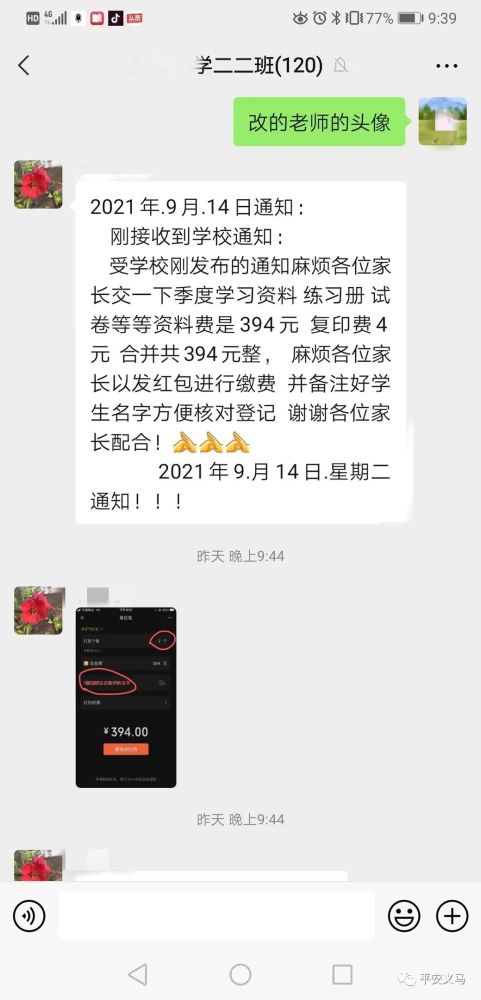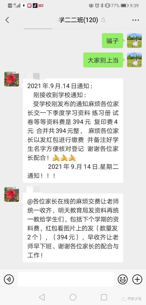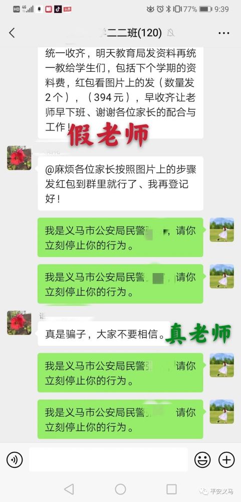 9月14日晚9點39分,在我市某小學家長微信群里,突然出現了第二個班主任,這位“班主任”發布了一份以假亂真的學校通知,要求每位家長以發紅包備注名字的方式上交學習資料費共計394元。只是這位“假班主任”萬萬沒想到,群里的學生家長中“藏”著真警察。不到一分鐘的時間,騙術被揭穿,家長群里上演了一幕“教科書式”反詐行動。