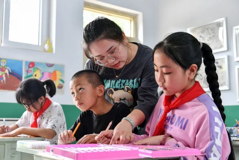 9月3日,在山西省陽(yáng)泉市平定縣巨城鎮(zhèn)鳳凰垴小學(xué),老師在指導(dǎo)學(xué)生畫(huà)畫(huà)。新華社發(fā)
