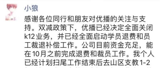 同時,新東方在線副總裁、東方優播CEO朱宇也表示,個人計劃未來將去山區支教1-2年。