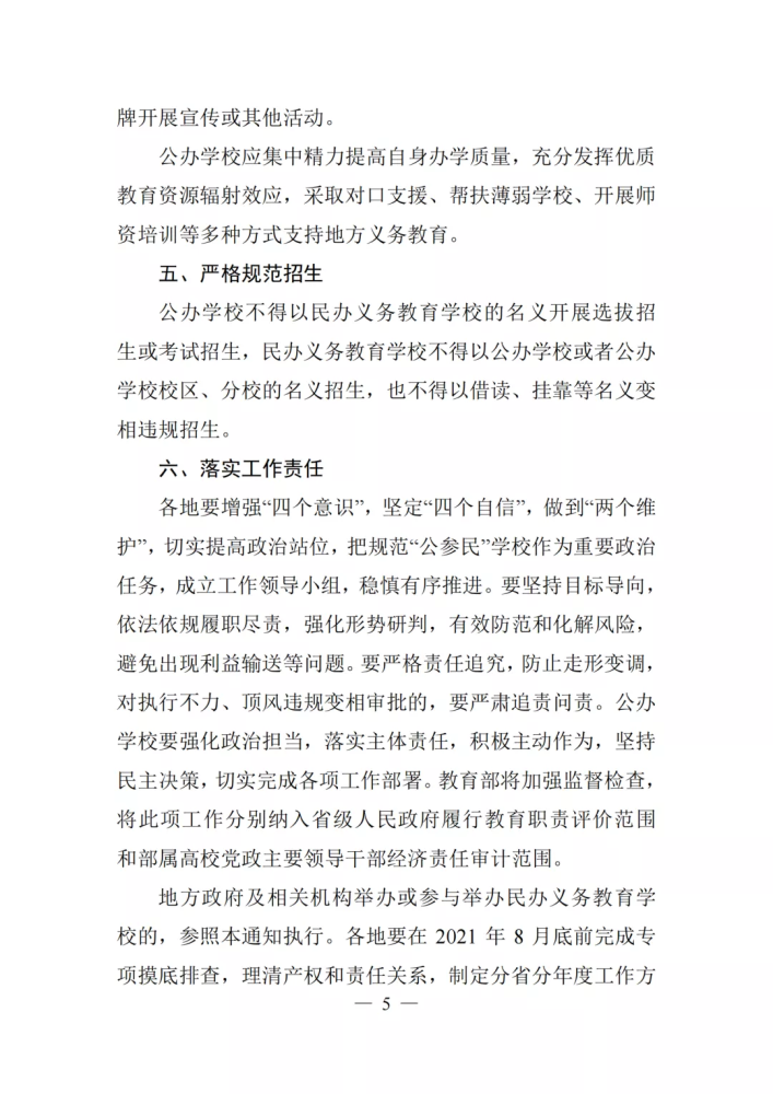 5.不再審批設(shè)立新的“公參民”學(xué)校,公辦學(xué)校也不得以舉辦者變更、集團(tuán)辦學(xué)、品牌輸出等方式變相舉辦民辦義務(wù)教育學(xué)校。
