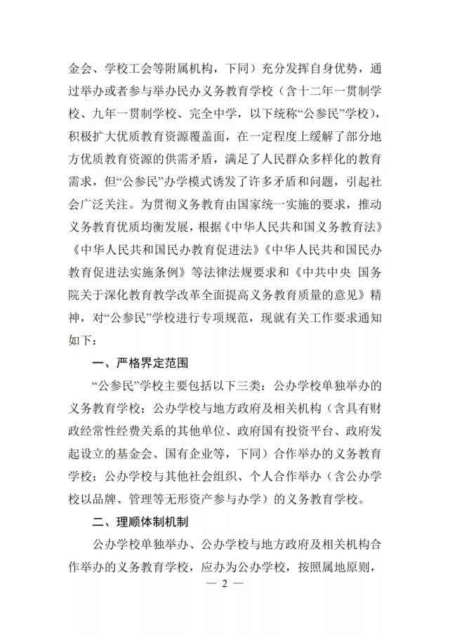 要求公辦學(xué)校單獨(dú)舉辦的民辦、公辦學(xué)校與地方政府及相關(guān)機(jī)構(gòu)合作舉辦的義務(wù)學(xué)校,應(yīng)辦為公辦學(xué)校;不再審批新的“公參民”學(xué)校,公辦學(xué)校也不得以舉辦者變更,集團(tuán)辦學(xué)、品牌輸出等變相舉辦民辦義務(wù)教育。通知中對名校辦民校(公參民)的范圍做了界定。