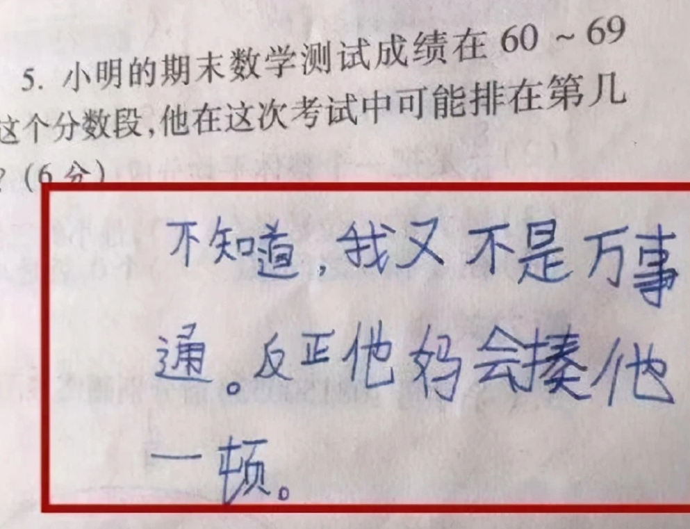 這位小學(xué)生的答案是:我不是萬事通,反正他媽會揍他。這個答案清奇好笑,但是你是否想過,你考試如果考到了60-69這個分?jǐn)?shù)段,你的媽媽也是會揍你一頓的,所以考試時別任性。