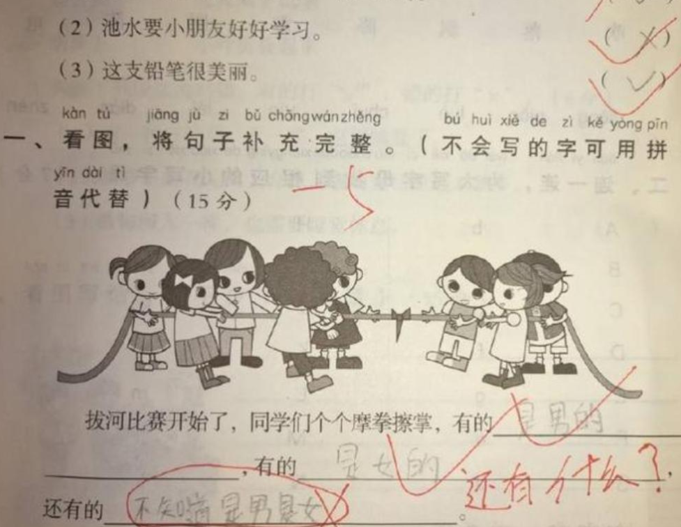 填空題是試卷中最常見的題型,但是看小學(xué)生的填空題,真的就像是在開盲盒。老師本來是想要讓學(xué)生通過做這道題,去鍛煉學(xué)生的理解能力,結(jié)果卻讓學(xué)生的重點放在了男女性別上。