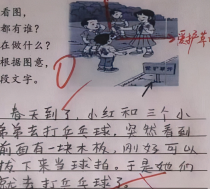 請看這位小學(xué)生的試卷,題目的意思是要教育小學(xué)生愛護(hù)草坪,還特意在很醒目的位置放置了一個“愛護(hù)草坪”的牌子。不過這位小學(xué)生卻將它當(dāng)成了乒乓球拍用,難怪老師會給零分。