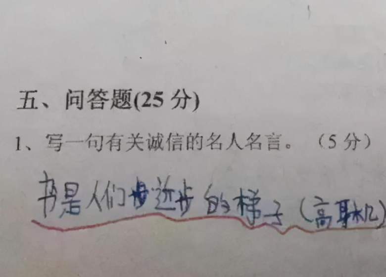 高爾基曾說過:書是人類進(jìn)步的階梯。但是這位小學(xué)生從名人到名言,寫錯了一半的字,看后讓人笑出眼淚。以后可得多加練習(xí),小錯誤不斷是很難在考試中拿高分的。