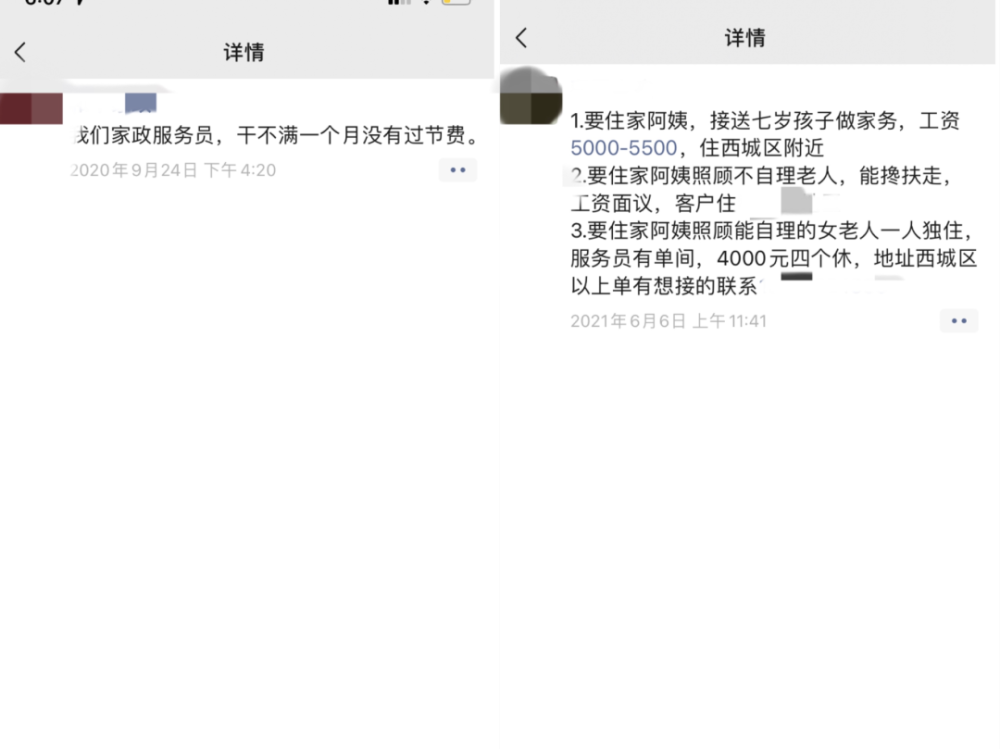 而在另一個分類信息網58同城上,家政業務則更加繁雜和細分。接送孩子是一項摻雜在鐘點工業務中的一項,其中還包括孩子陪護、早教啟蒙等服務,價格也是2000元-4000元不等。
