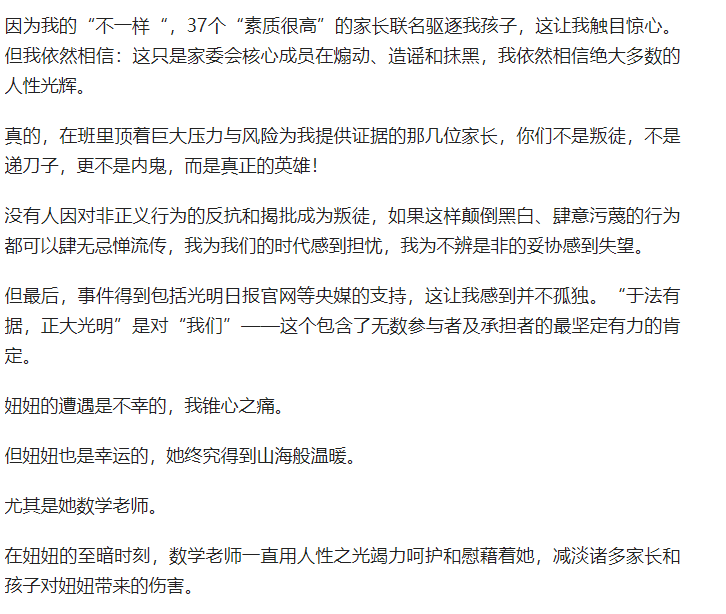 第五、被各方反復(fù)提及的不愿做“雞娃”,所以被37位家長和老師排擠。
