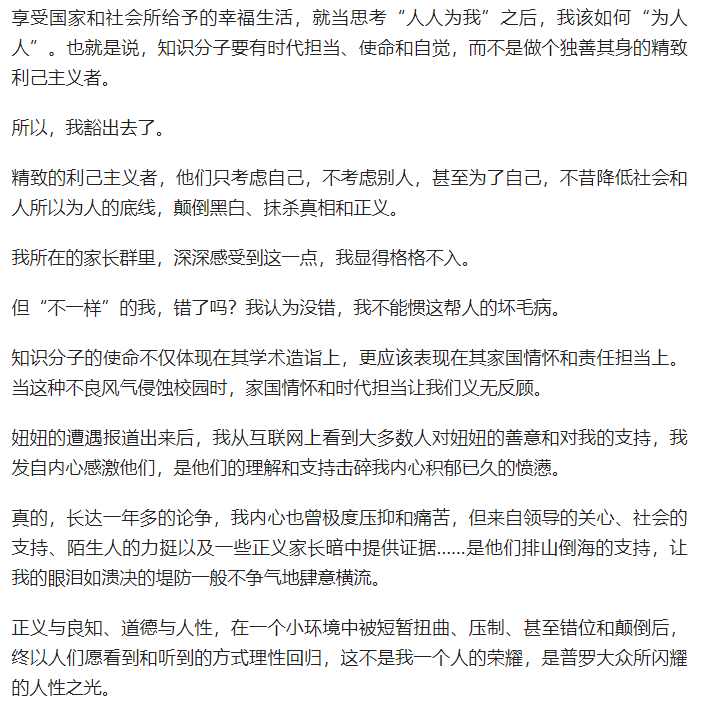 洋洋灑灑幾千字的一篇《妞媽的自白》,用詞也是極盡煽情之能事。搞出來什么“個(gè)人或社會進(jìn)步的成長與代價(jià),由我們來承擔(dān)”,“知識分子要有時(shí)代擔(dān)當(dāng)、使命和自覺”,“顛倒黑白、抹殺真相和正義”……一大堆的高大上口號。