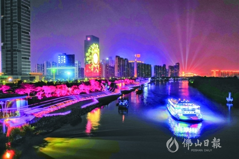 三龍灣游船行經流光溢彩的東平水道龍舟廣場段。/佛山日報記者張弘弢攝