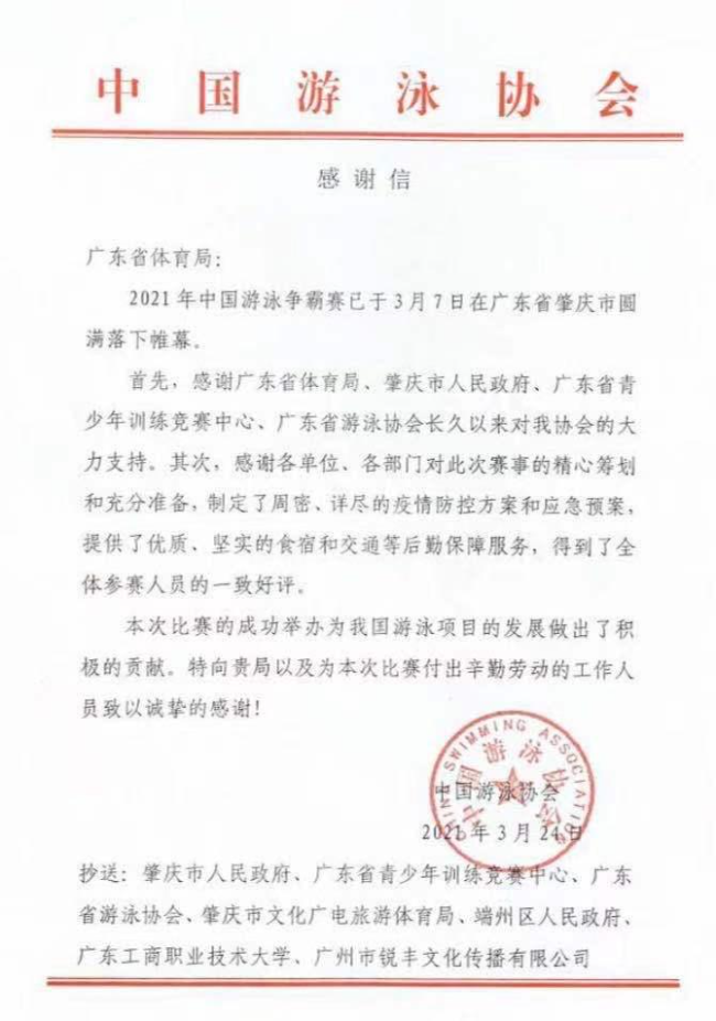 24日,中國游泳協會向廣東省體育局發來了感謝信,信中表示,2021年中國游泳爭霸賽已于3月7日在廣東省肇慶市圓滿落下帷幕,本次比賽的成功舉辦為我國游泳項目發展做出了積極的貢獻。