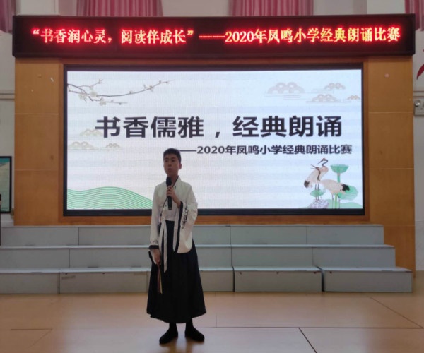 2020年9月11日,鳳鳴小學在修身學堂舉行經典朗誦比賽。參加本次活動的選手來自中、高年級。比賽現場,同學們的表現可圈可點。在題材方面,有《生命》、《校園早晨》、《祖國啊,我親愛的祖國》、《再別康橋》、《水調歌頭》、《可愛的中國》等等,既有現代詩歌,又有古典詩歌,文質兼美。在情感表現方面,選手們都經過認真準備,感情真摯,他們或歌唱祖國,或吟詠理想,現場高潮迭起,六(1)班潘英澤同學朗誦蘇軾《水調歌頭》,如癡如狂的樣子使觀眾深受感染;五(3)班徐晟桐同學朗誦梁啟超《祖國啊,我親愛的祖國》,全情投入,慷概激昂,豪情萬丈,獲得現場觀眾陣陣掌聲。選手們時而沉郁頓挫,時而低頭淺吟,他們憑借內容豐富、表現力強、形式創新征服了現場評委和觀眾。