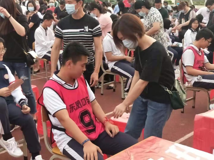 第五大環節由學生家長為孩子佩戴紅絲帶,給孩子送上中考寄語并深情擁抱。寫著中考必勝的紅色絲帶在微風中飄揚,初三的學生家長為自己的孩子系上象征著拼搏、奮斗的紅絲帶,并送上中考寄語,在深情擁抱中給予同學們來自親情的力量。