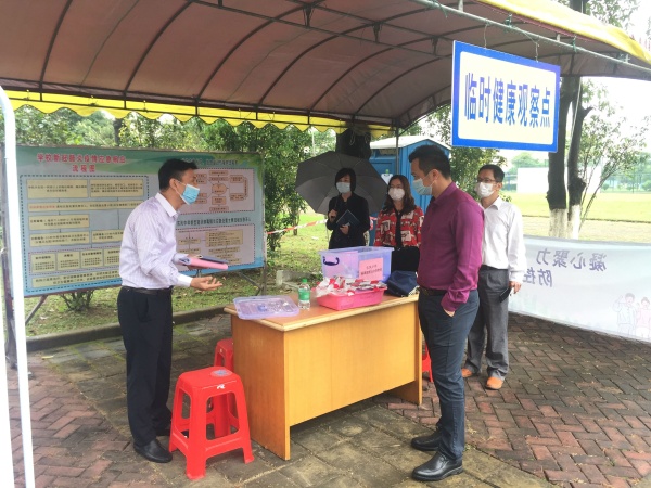 為確保師生生命安全和身體健康,4月22日下午,中山市2020年春季學(xué)期學(xué)生返校疫情防控驗收組蒞臨東鳳中學(xué)進(jìn)行驗收。以市教體局副局長黃學(xué)禮為組長的驗收組蒞臨東鳳中學(xué),驗收學(xué)生返校準(zhǔn)備工作,市衛(wèi)健局李雷,市市場監(jiān)管局陳政波,市教體局嚴(yán)慶中等專家參與驗收工作,東鳳鎮(zhèn)黨委委員劉燕文、文體教育局局長黃春光、鎮(zhèn)教育事務(wù)指導(dǎo)中心主任熊小潮陪同。