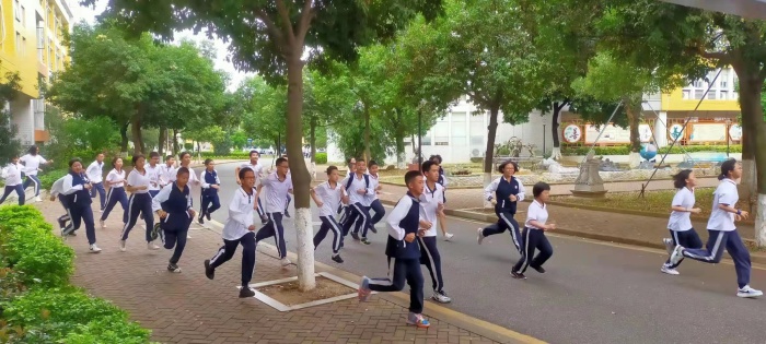 一陣急促的警報聲響起,學生們迅速用袖子捂住口鼻,彎著腰,跑向操場。全體教師按照既定的路線,組織學生有序逃生。全體人員撤離到運動場后,立即清點人數并向主席臺匯報。整個演練過程緊張有序,全體師生全部撤離到安全區域,達到較好的演練效果。