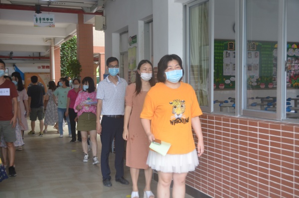 上學晨檢演練環節中,四至六年級實行分批錯峰上學,學生保持1米以上距離,排隊從正門測溫通道進校,體溫正常,無其它不適者按既定路線進入教室,體溫異常者立即啟動發熱應急處置方案。