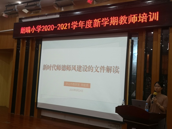 8月28日是培訓(xùn)第一天,劉珺主任首先向全體教師致以新學(xué)期的問候。接著,特邀中山市教研室辦公室朱敏嫣主任開展《新時(shí)代師德師風(fēng)建設(shè)的文件解讀》講座。朱主任通過案例、視頻和熱點(diǎn)話題,深入解讀新時(shí)代師德師風(fēng)建設(shè)的相關(guān)文件。全體教師深受教育和啟發(fā),立志爭做新時(shí)代“四有”好老師。