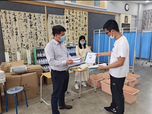 4月13日,陳婷婷老師接到東區(qū)教育事務指導中心給她的新任務,前往協(xié)助東區(qū)團益學校準備物資、設置臨時隔離區(qū)、健康觀察點,參加應急演練,迎接返校前上級單位的各項檢查,給初三返校教職工開展新冠肺炎疫情防控知識講座,給保潔人員、食堂工作人員講解消毒劑的配制等。