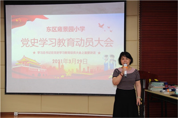 2021年3月29日下午,東區(qū)雍景園小學(xué)召開(kāi)黨史學(xué)習(xí)教育動(dòng)員大會(huì),認(rèn)真學(xué)習(xí)習(xí)近平總書記在黨史學(xué)習(xí)教育動(dòng)員大會(huì)上的重要講話精神,傳達(dá)全市及東區(qū)街道黨史學(xué)習(xí)教育動(dòng)員大會(huì)的內(nèi)容要求,部署開(kāi)展黨史學(xué)習(xí)教育的相關(guān)工作。