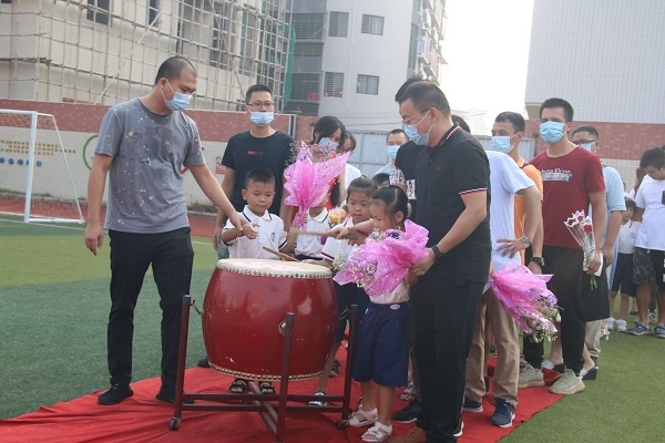 “咚咚咚……”,明智鼓擊響,一年級新生在家長的牽引下,順著紅地毯緩緩進場。他們在“入學門”前擊鼓后穿過“入學門”,行至班級隊列相應位置。孩子們的任課老師也列隊進入相應班級隊伍中。