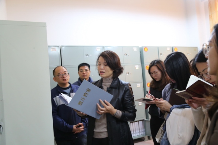 第一階段,與會(huì)活動(dòng)人員集中到東升中學(xué)檔案館進(jìn)行實(shí)物參觀。梁老師就東升中學(xué)檔案布局、實(shí)物陳列以及文本文檔應(yīng)該如何擺放陳列,以及檔案室管理進(jìn)行了現(xiàn)場(chǎng)指導(dǎo)講解。她提醒參觀人員,檔案陳列擺放以及檔案室管理要做到細(xì)致規(guī)范。就各中小學(xué)檔案管理員提出的問題,梁老師給予了細(xì)致解答。