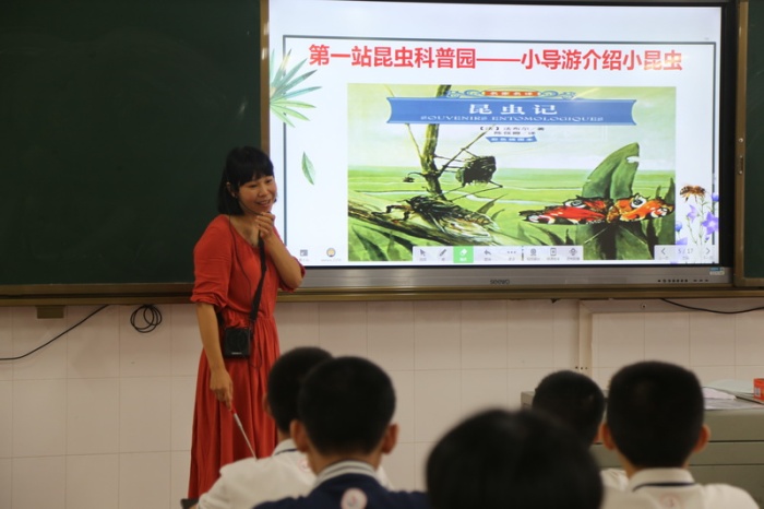 調研組先聽取了東升中學初二年級語文學科吳銀芳老師執教的《昆蟲記》名著導讀課,并在課后針對執教教師的課堂教學情況給予全面的評價,充分肯定教師教學工作的亮點,同時也對教師提出中肯的意見和建議。聽課專家一致認為,吳銀芳老師以小組合作的方式,利用愛米云平臺和希沃白板,充分挖掘和發揮智慧課堂的潛力;與此同時,吳老師還結合“先學后教、小組合作、當堂訓練”高效課堂教學模式,讓學生從被動學習轉化為主動學習,切實實現了將課堂還給學生。