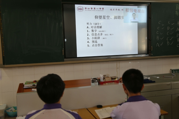 中山市初三中考英語聽說考試即將進行。為了讓東升中學學生在中考中取得佳績,6月18日下午,東升中學有幸請來中山一中初中部范振海副校長(現兼任西區中學校長)對初三學生英語聽說考試進行答題技巧指導。范校長曾任東升鎮旭日中學校長多年,是東升人民的老朋友。范校長的講座題為《仰望星空,腳踏實地》。作為資深的英語專業教師,他高屋建瓴地從宏觀和微觀的角度對英語聽說考試進行了精準到位的分析,并從對話理解、短文理解、朗讀短文、情景對話、口頭作文等五個方面各個擊破,為在座的學生提供了很好的方法指導。由于防疫需要,本次指導講座是利用校園電視臺進行“現場直播”的,東升中學初三全體學生和全體英語老師實時到班參與和觀看了指導講座。