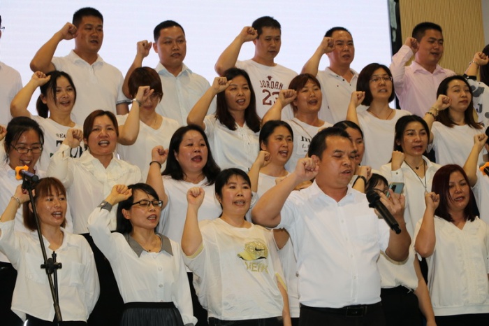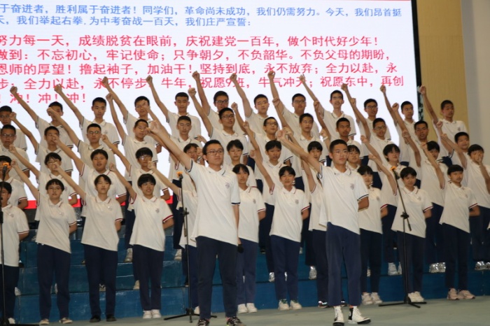 誓師大會主旋律登場了。初三全體教師率先登場宣誓:為同學們今年中考保駕護航成為老師們的最強音。隨后,各班級依次登臺亮相,發出了他們迎接中考的心聲。從同學們激昂嚴肅的臉龐上,人們看到了“拼搏、奮戰、苦戰、加油”的靈魂飄蕩;從同學們振奮人心的口號聲中,人們聽出了“全力以赴、百煉成鋼、勤學苦練、斗志昂揚、讓夢想飛翔”的力量與勇氣。家長代表們也來誓師了,他們為孩子們“加油喝彩”。