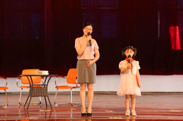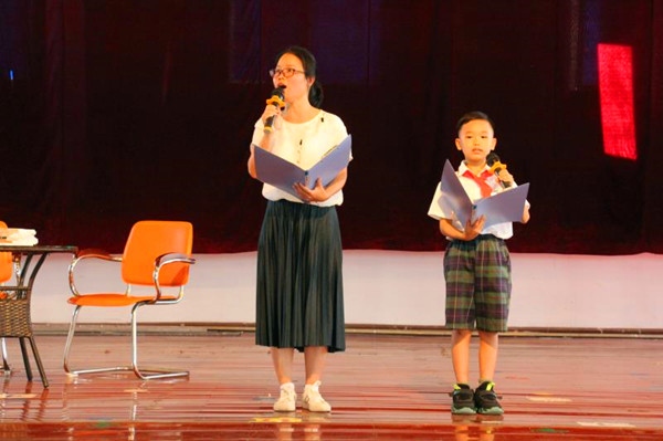 第一環節是教師“領讀者”代表和兩個親子家庭朗讀展示。首先由李偉霞老師、王鳳群老師、張玉云老師給大家帶來的“領讀者”分享拉開序幕,她們身著盛裝、手持書卷,帶著對經典的敬畏,或時而激昂澎湃、時而婉轉低回,帶著對朗讀的熱愛一一登上舞臺……自從學校開展讀書活動以來,很多家庭也投入到了讀書活動中。接著由何堅輝親子和潘麗韞親子為我們進行分享,不僅要讓書香溢滿校園,更要讓書香走進每一個家庭。那一刻,整個氛圍因經典而美麗,因朗讀而沸騰!