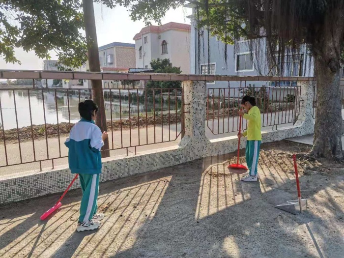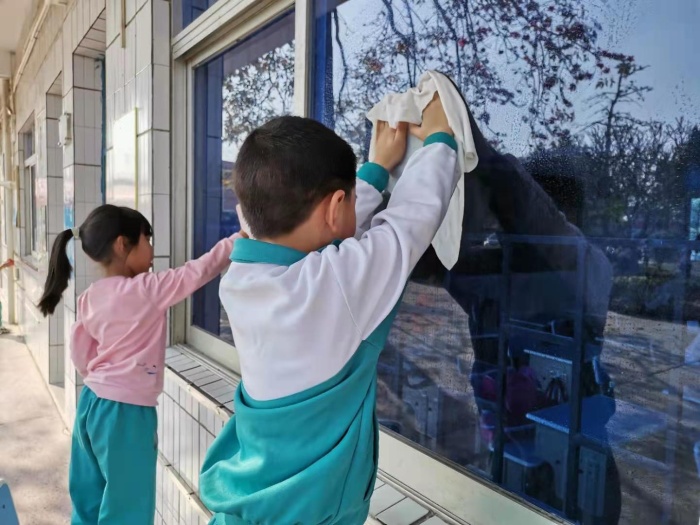 在大掃除的過程當中,孩子們分工合作,井然有序地完成每一項清潔工作:擦窗、掃地、清潔桌椅,甚至連包干區中的小小落葉也不放過,力圖以自己的微小力量將校園打理得整潔靚麗,共同創造一個清新舒適的校園環境。