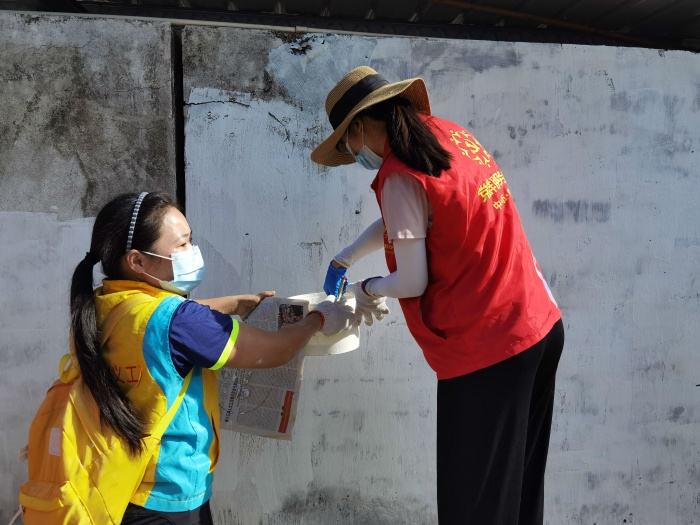 活動開始后,大家集中在學校側門,看見學校圍墻外的雜草和垃圾,就自發地拿起掃把和鏟子,年齡小一點的孩子還主動用雙手撿起垃圾,不一會兒,圍墻外的地面就變得干干凈凈。當知道可以開始粉刷圍墻時,孩子們立刻拿出自己帶的小桶,拿起刷子蘸著粉漿開始刷墻,家長們在一旁指導孩子們的動作,讓孩子們感受勞動的樂趣。老師們也拿起滾筒刷,為美化校園圍墻出一份力。在勞動過程中,全體志愿者明確分工,積極合作,干得熱火朝天!大家人人動手,不怕臟,不怕累,光禿禿的學校圍墻很快就變得潔白干凈。