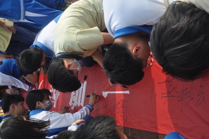 在放飛夢想的時刻,八、九年級全體學生在領(lǐng)誓人歐梓彥同學引領(lǐng)下舉起右拳嚴肅宣誓:在這神圣的時刻,我們用青春的名義發(fā)誓,奮斗一百天,用汗水博取成績;奮斗一百天,用智慧創(chuàng)造奇跡;奮斗一百天,用激情鑄就輝煌;奮斗一百天,讓夢想展翅飛翔。他們雄渾有力的宣誓聲音響徹整個校園,傳遍校園每一個角落。初三全體學生在家長代表,全體教師和學生們共同見證下熱血沸騰地在“百日誓師”紅色橫幅中寫下了自己的名字。