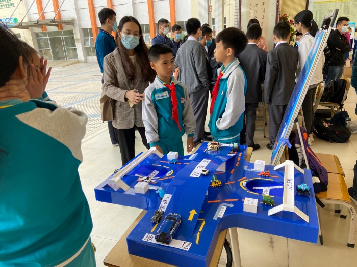 各參展隊以飽滿的熱情投入到活動中,展示自己的科學成果。每個項目組向評委講解其專題探究或“未來交通”解決的問題,評委向項目組成員提出問題,成員進行答辯。