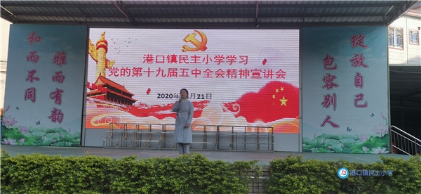 為深入學習貫徹十九屆五中全會精神,12月21日下午,民主小學黨支部邀請了十九屆五中全會宣講團到校宣講。本次活動由十九屆五中全會精神中山市宣講團講師、港口鎮中心小學林國瑜主任主講,港口鎮教育黨委副書記、教體文旅局副局長劉長路,港口鎮教育黨委成員代表民主小學黨支部書記李小健, 民主小學四五六年級全體少先隊員及全體支部黨員參加了此次活動。