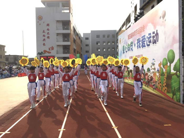 入場式完畢后,舉行了莊嚴的升國旗儀式,鮮艷的五星紅旗在全體師生的注目下冉冉升起。升國旗儀式結束后,廖潔瑩主任為本次運動會致開幕詞,運動員代表、裁判員代表分別宣誓。最后,梁銓華校長宣布“童心向黨·我愛運動”校運會正式開始!
