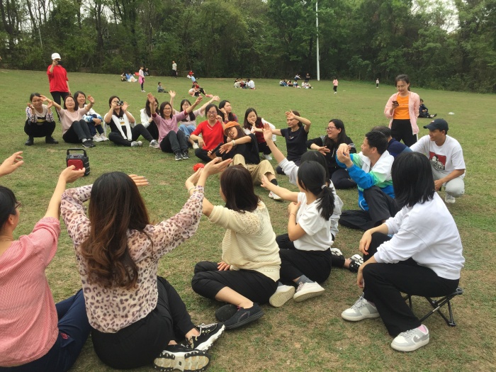和風微拂,紫馬嶺公園的草坪上傳來歡聲笑語,循聲而望,正在進行的是一場別出心裁的教師團建活動。全體老師抽簽分為六個小組,每組成員為自己設計組名、口號。而后在這片綠意盎然的草地上,各小組圍成一個大圈,紛紛鋪開桌墊,放上自己精心準備的美食,準備盡情地享受著。
