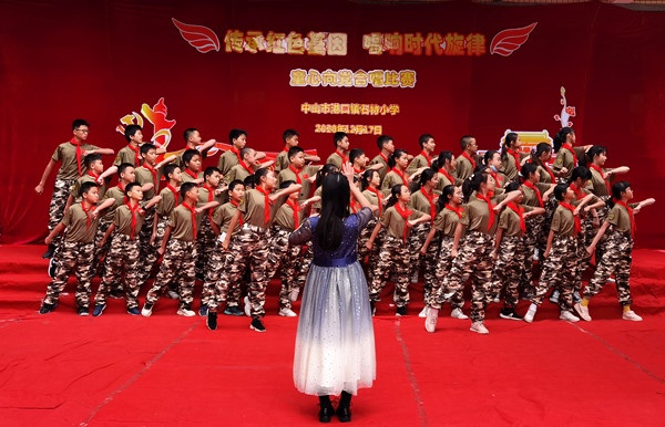 比賽接近尾聲,精彩仍舊接連不斷,周雅婷老師攜手中山市中等專業學校港口校區音樂老師黃詩陽共同演唱了歌曲《共筑中國夢》,悠揚靈動的歌聲響徹校園,直擊同學們的心靈,頓時掌聲四起。校跳繩隊也來為這場盛宴助興,活力四射。現場全體人員合唱的《歌唱祖國》更是將現場氣氛推向了高潮。最終,六(1)班、六(2)班、二(2)班獲得了本次比賽的一等獎。