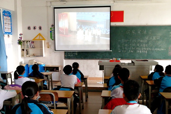 在第七個國家憲法日當天,全校師生通過青少年普法網,觀看教育部在北京舉辦的“憲法晨讀”活動,且于9:05-9:15 時段同步開展“憲法晨讀”活動。接著,各個班級開展了“學憲法,做守法小公民”主題班會活動。課堂上,班主任從身邊的事情說起,進一步加強學生的法治意識。同時,還引導大家反思自身的問題,明確養成良好行為習慣的重要性,做到防患于未然。同學們則踴躍發言,把自己學到的知識牢牢記在腦里,把憲法和國家也深深放在心中。班會結束后,同學們紛紛表示:要自覺遵守法律法規,從小事做起,爭做遵紀守法的好少年!