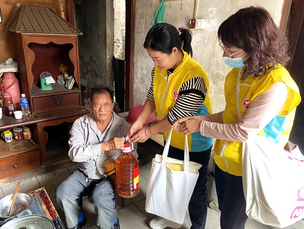 10點整,陽光柔柔地灑在校園的道路上,五對親子義工以及社區志愿者們在校門口集合。集合完畢后,親子義工和志愿者們上門對社區的老人進行慰問。一聲問候,兩句細語,談話時溢出無處不在的濃濃情意,在老人們的家里,他們與老人們拉拉家常,詳細了解他們家庭、生活和健康狀況,傾聽他們的心聲,提醒他們注意身體健康并送上慰問品,同時為老人們送去了節日的問候,讓老人們深深感受到了大家尊老敬老的愛心與溫暖。老人們臉上都掛著溫暖的笑容。