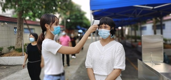 演練主要分為兩個環(huán)節(jié)。第一環(huán)節(jié),教師們扮演學(xué)生,戴好口罩,間隔1米,排好隊,錯峰等候入校。進(jìn)校前,接受體溫檢測,體溫正常則直接進(jìn)入校園。當(dāng)體溫異常時,檢測員報告值日行政,并將其帶到隔離區(qū),由隔離區(qū)的校醫(yī)監(jiān)管,同時聯(lián)系班主任,由其通知家長接走,疫情防控小組負(fù)責(zé)人根據(jù)實際情況反饋信息到相關(guān)部門。最后消毒人員對相應(yīng)區(qū)域進(jìn)行消毒。第二環(huán)節(jié),上課期間,如果有學(xué)生感到不舒服,任課教師對其進(jìn)行體溫檢測,確定體溫異常的,將其帶到樓道空曠處并報告班主任及校醫(yī),由校醫(yī)將該生帶到隔離觀察室觀察,做好三次檢測,并登記相關(guān)信息匯報疫情防控領(lǐng)導(dǎo)小組,由小組負(fù)責(zé)人撥打120等候處置。接著,班主任將其他學(xué)生轉(zhuǎn)移至備用教室,并做好學(xué)生安撫工作。