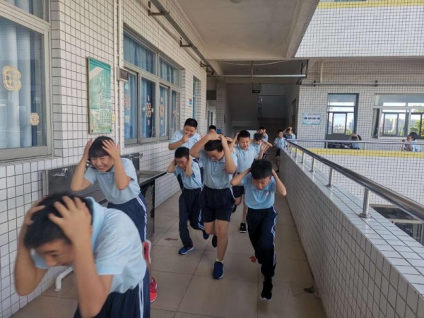 本次防震自救演練共分為三部分,分別是應急避震演練、緊急疏散演練和緊急集合演練。警報聲一響,全校師生進入緊急地震逃生的情境中,各老師迅速到疏散崗位,整個疏散過程配合默契,每位老師都將演練作為實戰應對,認真指揮,謹慎操作,確保萬無一失;各班學生在任課老師的有效組織下,雙手抱頭,彎腰前行,學生在最短的時間內,安全有序、快速到達安全地點,隨后各班隨即清點人數向梁偉佳主任匯報。