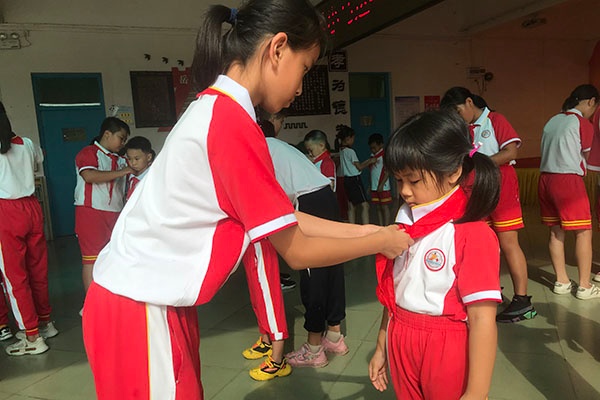 6月8日下午三點,隨著一聲“全體立正,出旗!敬禮!”的指令,少先隊隊旗手精神抖擻地邁著莊嚴而有節奏的步伐走來。在火紅的隊旗下,在星星火炬的指引中,全體少先隊員高唱《中國少年先鋒隊隊歌》。嘹亮的歌聲,唱出了每位同學心中的自豪與驕傲。大隊輔導員黃施雅老師宣讀了新隊員名單。瞧,同學們滿臉的笑容,激動的內心,老隊員為系好紅領巾的那一刻,是多么的神圣和富有使命感!接下來,黃老師帶領所有的隊員在隊旗下莊嚴宣誓,準備著為共產主義事業貢獻力量!