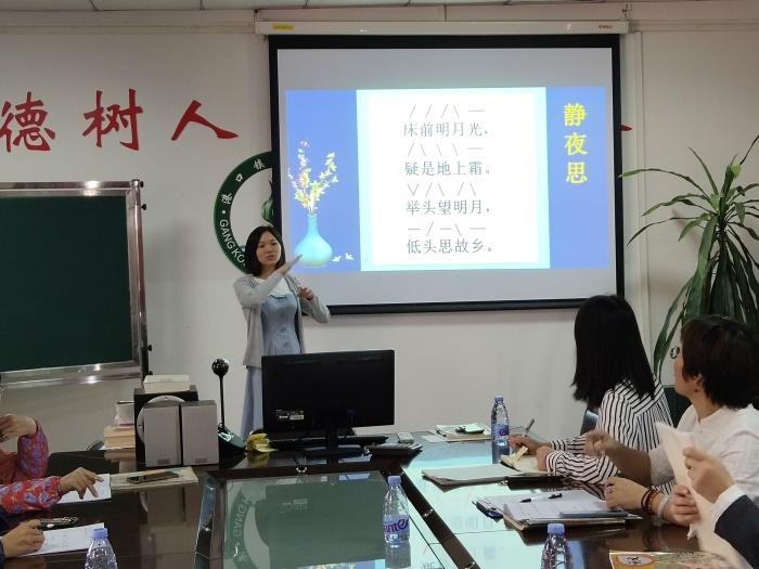 講到精彩之處,李老師以古詩《靜夜思》為例,通過不斷比劃普通話聲調的同等手勢,帶領全體語文教師一邊比手勢一邊吟誦詩歌。這種有趣又實用的教學方法,使整個會議室的氣氛活躍起來。
