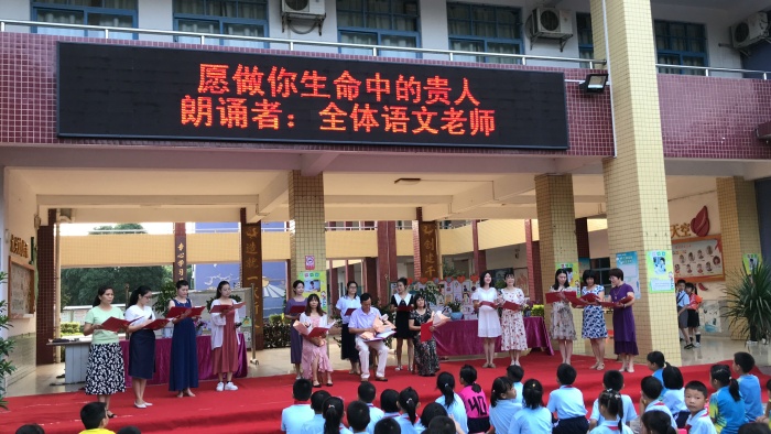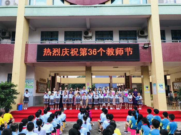 本次活動由六(1)班的梁智煌和六(2)班羅紫晴同學主持,全校師生共同參加了此次活動。在活動中,首先由秦聲通校長發表致辭,他向學校的老師們送上了節日的問候,并向長期以來堅守一線辛勤工作的老師們表示了真摯的感謝與深切的祝福。接著,少先隊員代表在熱烈的掌聲中為敬愛的老師們獻上鮮花、賀卡和繪畫,由此表示對老師們不盡的感恩與愛戴,老師們臉上綻放出慈愛又幸福的笑容,眼中流露出感動與驕傲的目光。隨后,由黃玉霞老師帶領語文科級組成員一起飽含感情地朗誦了詩歌《愿做您生命中的貴人》,將身為教師的自豪之情娓娓道出。然后,中年級學生代表黃曉彤、蔡平等同學帶來詩朗誦《尊師重教,感恩師情》,表達對教師的敬意。再由,高年級學生代表張鈺嫻送上《寫給老師的一封信》表達了每位學生對老師們崇高的敬意和深刻的愛意。最后,全體學生合唱一首《老師》,把感恩之心送給敬愛的老師們,并向全體老師道謝“老師,您辛苦了”。在一片歡樂與感動中,“感恩教育”的教師節活動圓滿拉下帷幕。