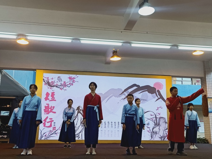 最后,學校誦讀社團獻上了他們別出心裁的表演——《短歌行》。各位誦讀愛好者們以“山不厭高,海不厭深。周公吐哺,天下歸心”二句曹孟德的肺腑之言收束全場,回環往復,蕩氣回腸。