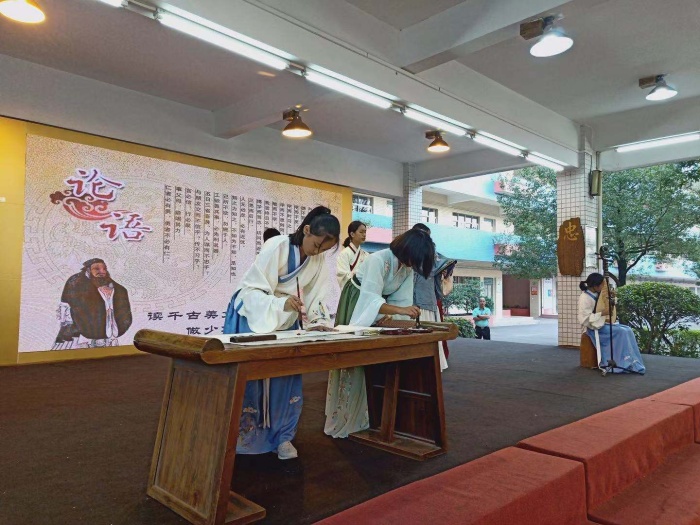 決賽在同學們的歡呼聲中拉開序幕。率先登場的是《琴聲悅耳書墨賞心——<論語>經典誦讀》節目。有道是:“天不生仲尼,萬古如長夜”,在悅耳的琵琶聲中我們一覽圣人之風采,重溫圣人之教誨。接著是《蘇軾詞三首》,須眉多鐵骨,殊不知柔腸也丈夫。6名演出者一襲青衣,演不盡的是蘇軾的俊逸與浪漫,道不完的是他的樂觀與曠達,兩名舞者在旁循聲起舞,好不讓人心生歡喜!諸葛家書代代傳,修身立德孝圣賢。一(12)的《誡子書》把現場的氛圍燃至了最高點。一個可愛的“諸葛亮”緩緩向舞臺中央走去,手持羽毛扇,頭戴綸巾,在學童心間播撒智慧的種子;12名“學童”席地而坐,吟誦著圣賢之語;3名紅衣舞者應節而舞,給人以視覺聽覺極大的享受。