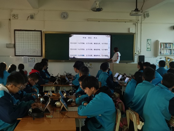 啟動儀式由兩部分組成,第一部分由語文科組孫欣欣老師展示智慧課堂吟誦課。在展示課上,孫欣欣老師緊扣住吟誦重難點,環節設計巧妙,學生勇敢嘗試,一句句充滿古韻的吟誦充分展示了中華傳統文化的博大精深。課堂上,孫老師利用教學平板展示吟誦的技巧,學生利用教學平板實時上傳吟誦音頻,現代化的教學設備和中華傳統文化的融合讓老師們充分感受到信息技術和學科融合的魅力。