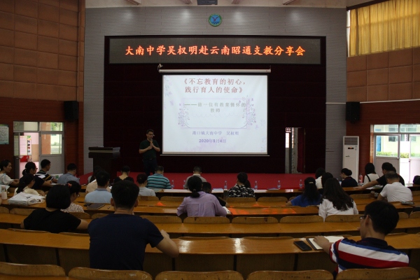 2020年9月4日下午,大南中學吳權明赴云南昭通支教分享會在一樓階梯室舉行,港口鎮黨委委員羅希京、港口鎮教育事務指導中心教研專干蘇少偉、大南中學70余位老師參加了此次分享會。