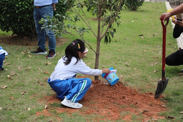 一陣忙活之后,帶來的小樹苗都已“對號入座”,在松軟的新土上悄然生長,它們日后定會成為挺秀的綠樹,成為中山華附的風景線。經此活動,同學們收獲了綠色,體驗了勞動的快樂,也必將愛護環境的意識留在心中。